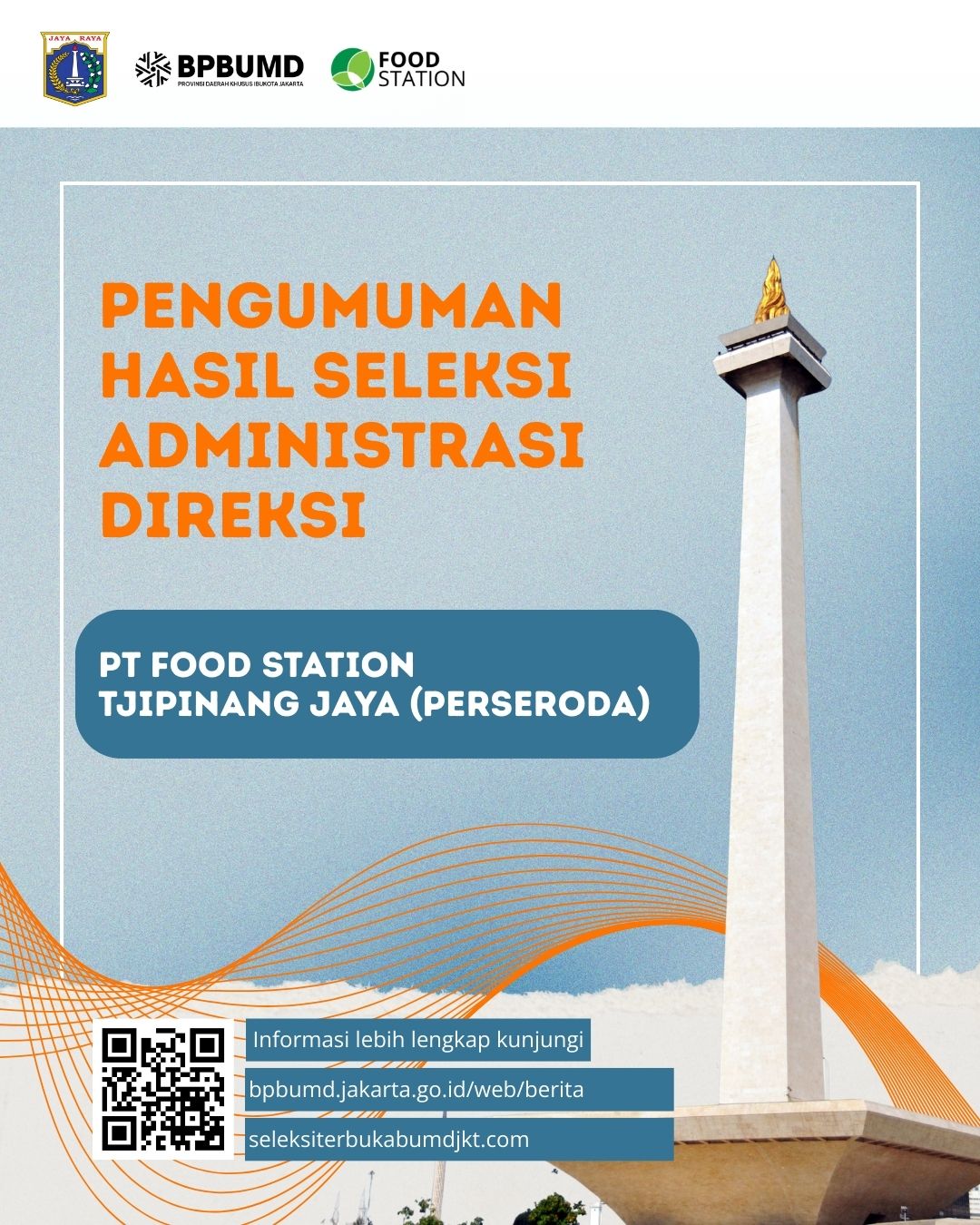 Merujuk Pengumuman Kepala Badan Pembinaan BUMD Provinsi DKI Jakarta Nomor 597/KH.11 tanggal 11 Agustus 2025 tentang Seleksi Terbuka Jabatan Direktur Utama dan Direktur Operasional dan Bisnis PT Food Station Tjipinang Jaya (Perseroda) Tahun 2025, dengan ini kami umumkan hasil seleksi administrasi.