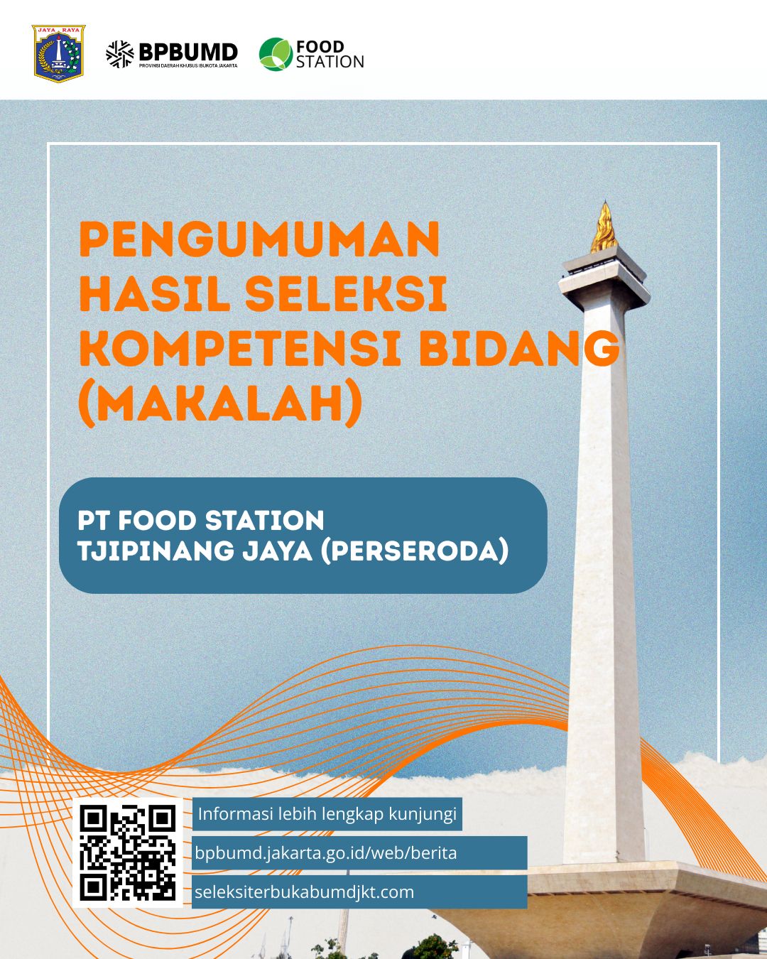 Merujuk Pengumuman Kepala Badan Pembinaan BUMD Provinsi DKI Jakarta Nomor 597/KH.11 tanggal 11 Agustus 2025 tentang Seleksi Terbuka Jabatan Direktur Utama dan Direktur Operasional dan Bisnis PT Food Station Tjipinang Jaya (Perseroda) Tahun 2025, dengan ini kami umumkan hasil seleksi kompetensi bidang (penulisan makalah)