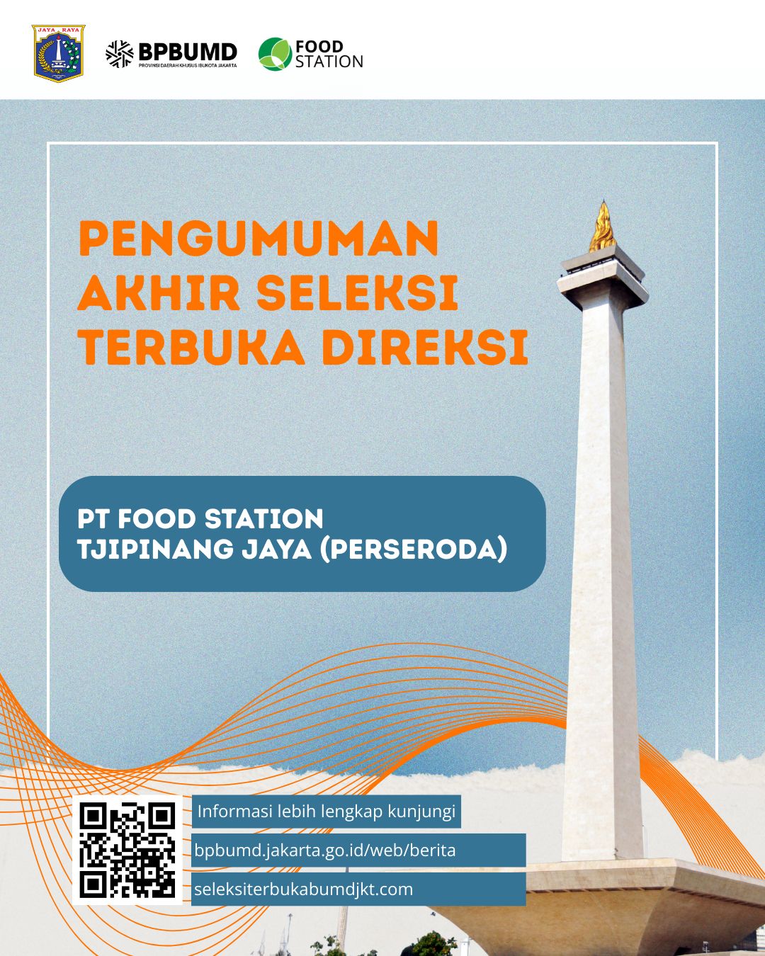 Merujuk Pengumuman Kepala Badan Pembinaan BUMD Provinsi DKI Jakarta Nomor 597/KH.11 tanggal 11 Agustus 2025 tentang Seleksi Terbuka Jabatan Direktur Utama dan Direktur Operasional dan Bisnis PT Food Station Tjipinang Jaya (Perseroda) Tahun 2025, dengan ini kami umumkan hasil seleksi akhir pengadaan calon Direktur Utama dan Direktur Operasional dan Bisnis PT Food Station Tjipinang Jaya (perseroda)