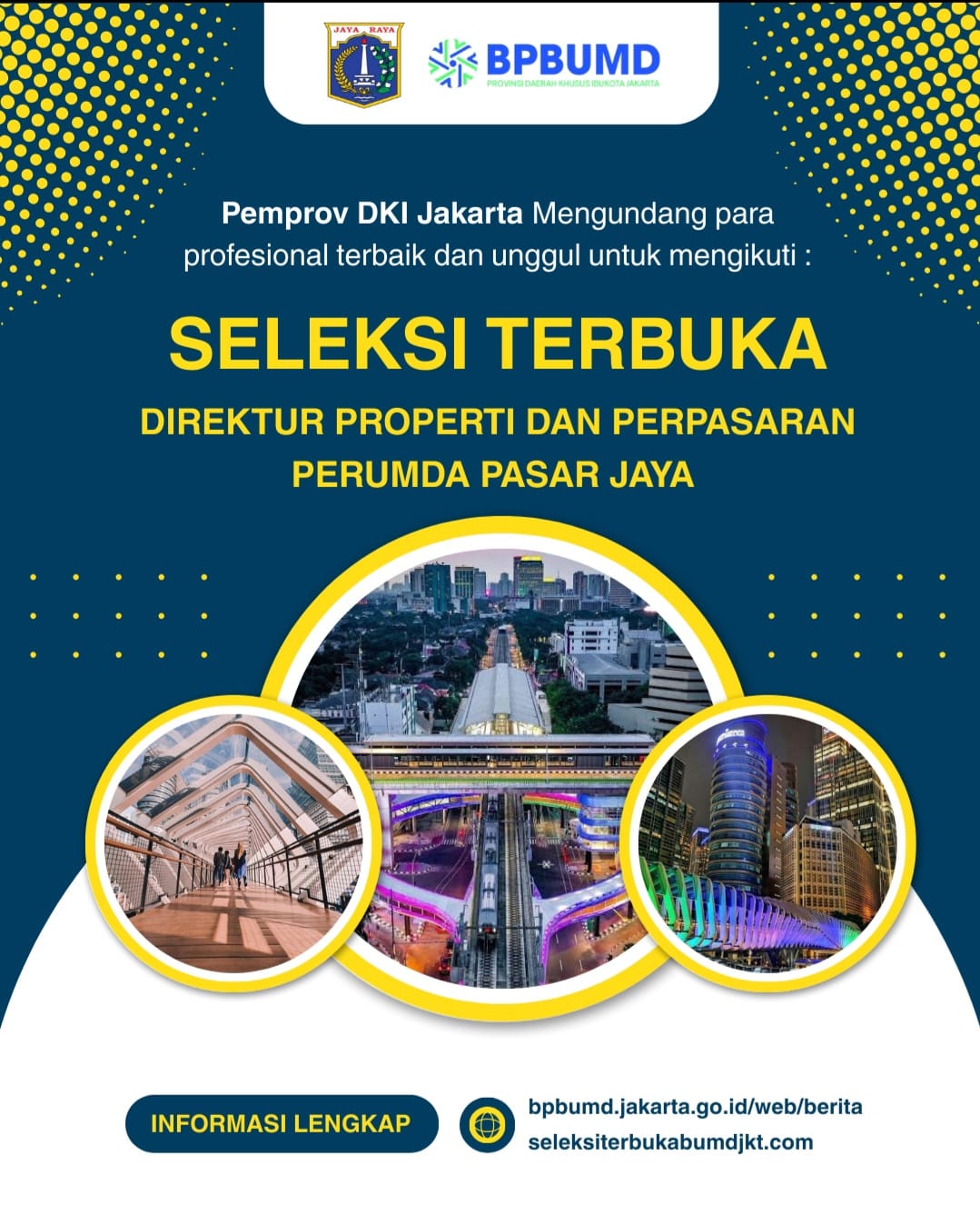 Pemerintah Provinsi DKI Jakarta melalui Badan Pembinaan BUMD mengundang para profesional terbaik dan unggul untuk kembali mengikuti proses seleksi terbuka untuk Jabatan Direktur Properti dan Perpasaran Perumda Pasar Jaya.